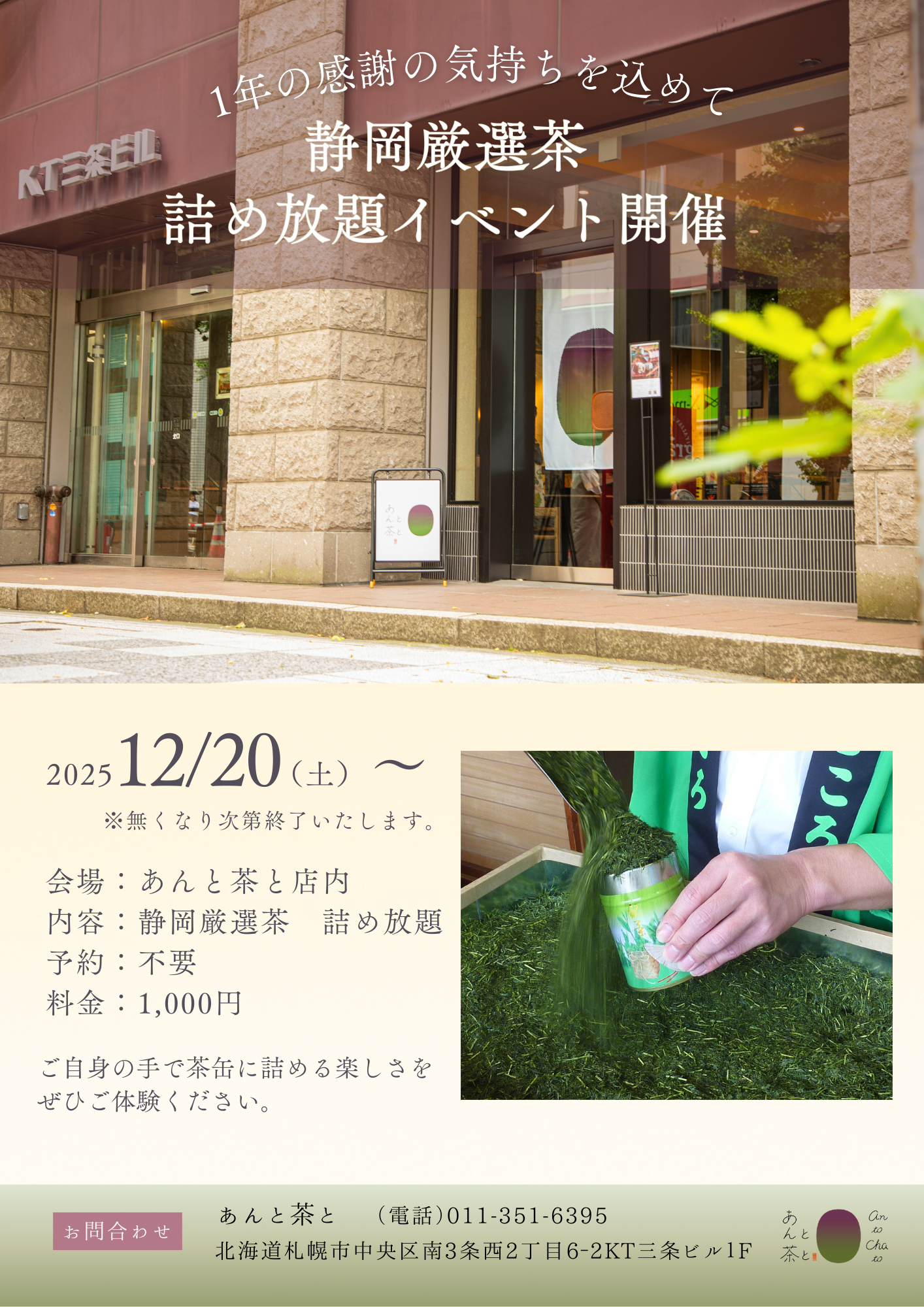 2025.12.22 イベント 静岡茶詰め放題イベント開催のお知らせ 今年も1年、あんと茶とをご愛顧いただきありがとうございました。 そんな感謝の気持ちをこめて、年末の特別企画をご用意いたしました。 12月20日(土)より、静岡茶の詰め放題イベントを開催いたします。 静岡茶詰め放題 価格:1,000円(税込) 茶葉が無くなり次第終了となります。 この機会に、ぜひあんと茶とこだわりの静岡茶をお楽しみください。