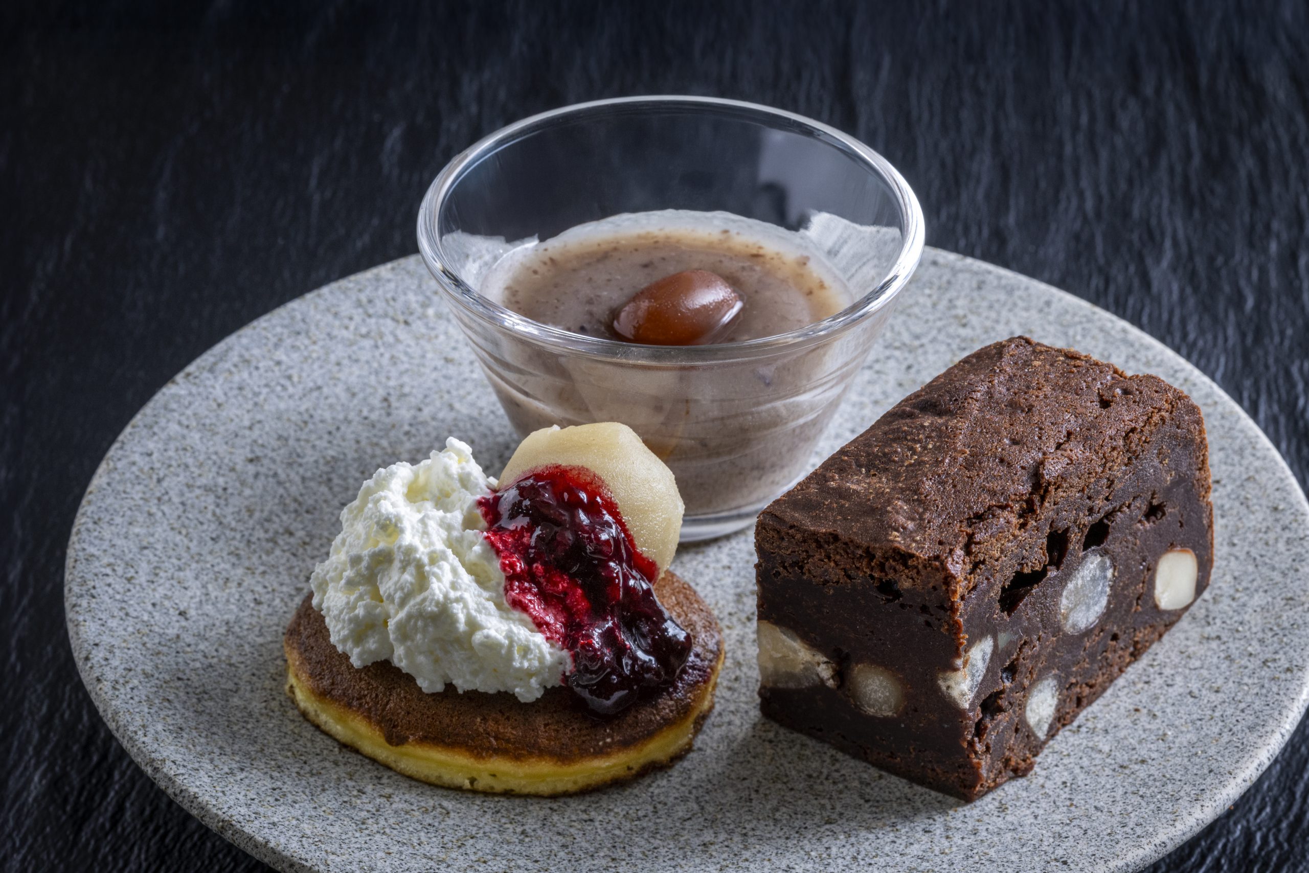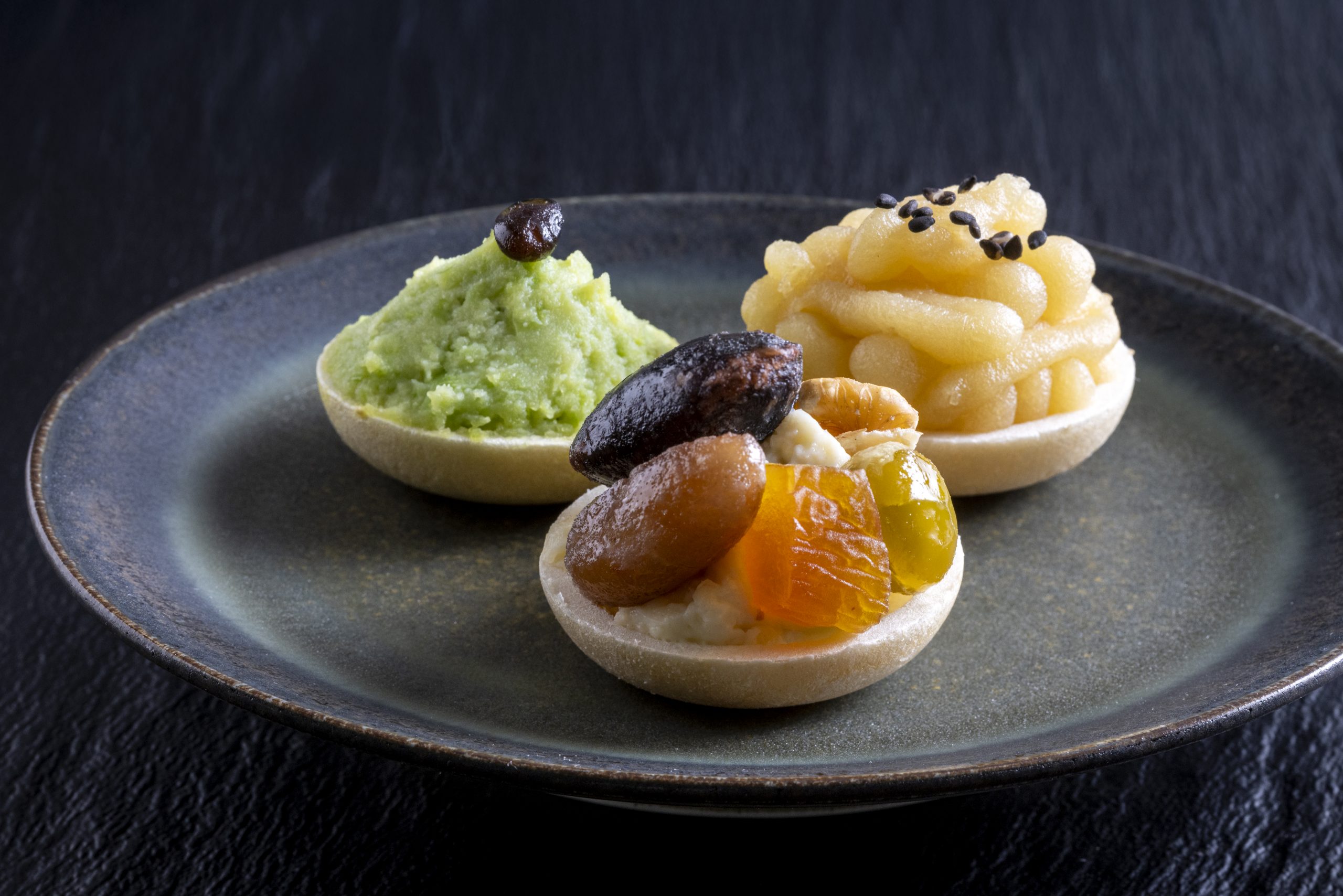新たに加わった“一口甘味”は、いも餡をモンブランのように絞ったもの、やさしい甘さのずんだ餡、クリームチーズをベースに紫花豆・青えんどう豆・赤中長豆・くるみ・ドライフルーツを組み合わせた彩り豊かな吹き寄せなど、季節の味わいを小さなひと口にぎゅっと詰め込んだ、可愛らしい一品が揃います。