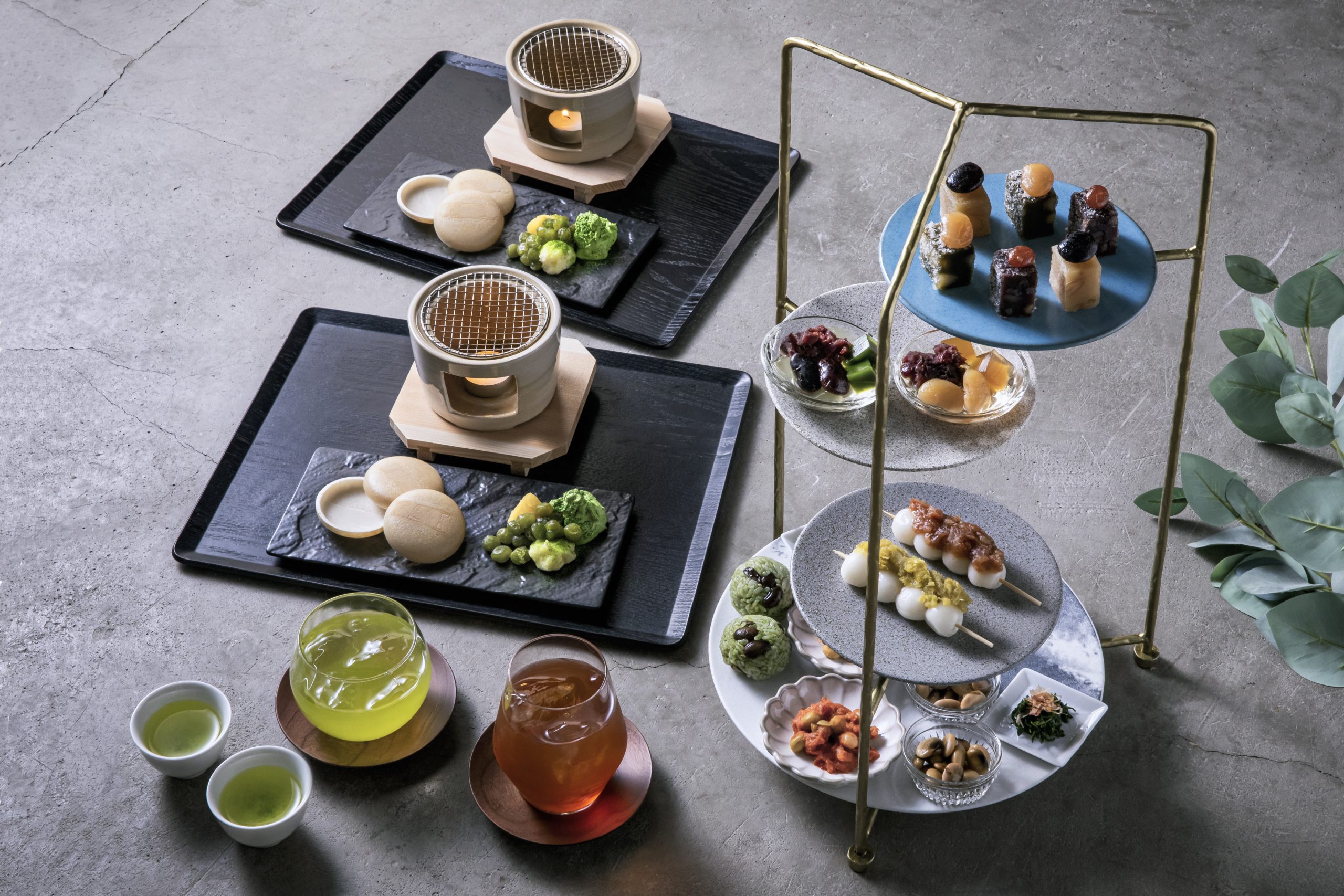彩り鮮やかなお菓子とお茶に、季節感あふれるセイボリーを添えた